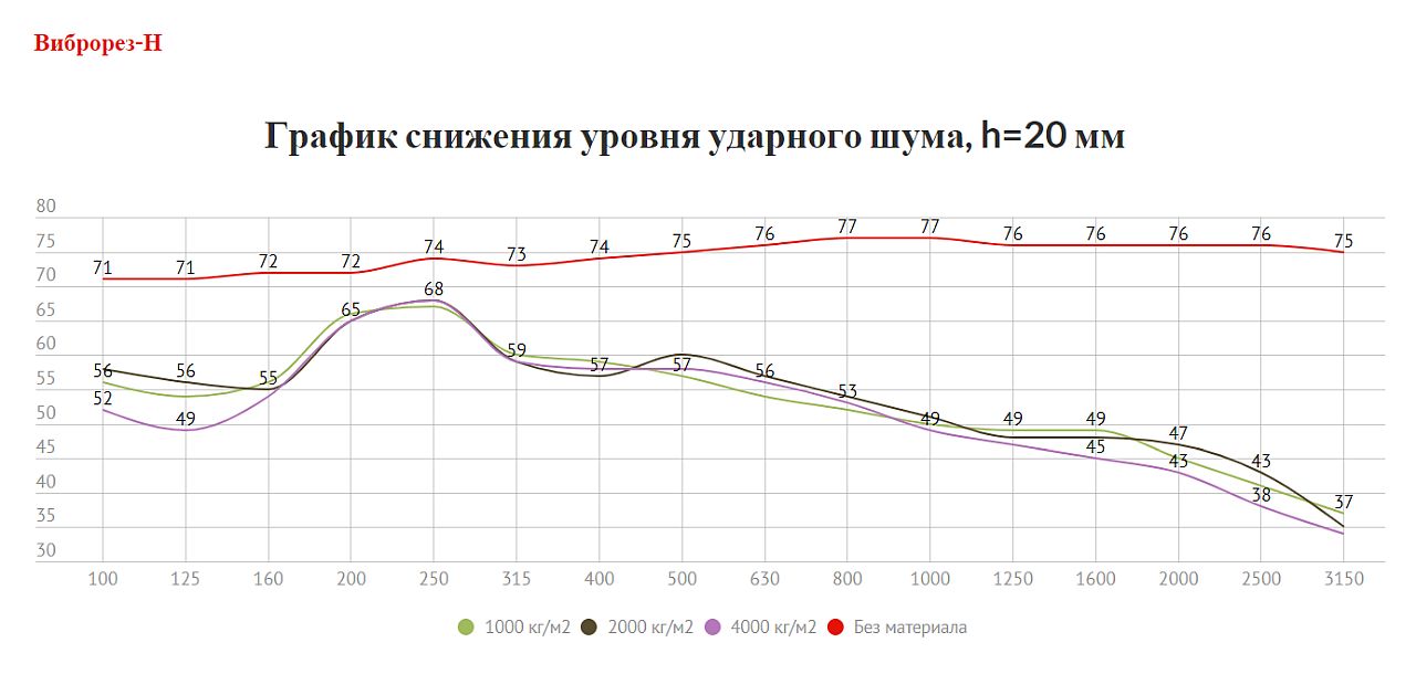 | Изоляция ударного шума (ΔLn,w) при 1000 Гц и h=20мм, не менее, | дБ | 20 | ± 10% |